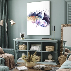 - En färgglad stad gömd under abstrakta paraplyer skapar en dynamisk komposition. En perfekt bild för moderna interiörer.