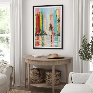 - Denna poster i impressionistisk stil föreställer en kvinna som går bland färgglada byggnader. Dess livfulla färger och konstnärliga uttryck gör den till den perfekta dekorationen för moderna interiörer.