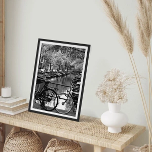 • Denna svartvita poster föreställer en pittoresk kanal i Amsterdam, med cyklar framträdande i förgrunden. Perfekt för minimalistiska eller klassiska inredningar. Postern levereras med en svart ram.