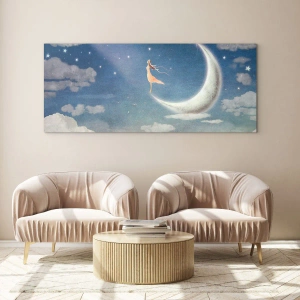 Glastavla - Bild på glas - En kvinna i en böljande klänning stående på månen i en stjärnklar himmel. - 70x50cm - Blå friare - Modern väggdekoration för vardagsrum och sovrum ARTTOR