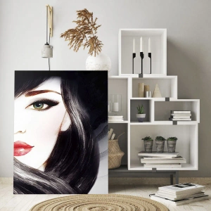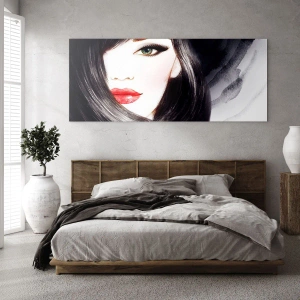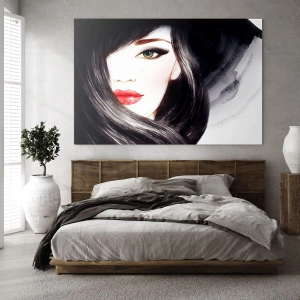• Kvinnans ansikte, röda läppar, gröna ögon, Människor, mode, vintage och retro, För matsalen, För hallen, För vardagsrummet, För sovrummet, , Vit, Svart, Röd, Vertikal