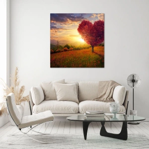 - Denna vackra målning föreställer ett hjärtformat träd mot en pittoresk solnedgång och ett blomsterfält. Det är den perfekta dekorationen för romantiska interiörer.