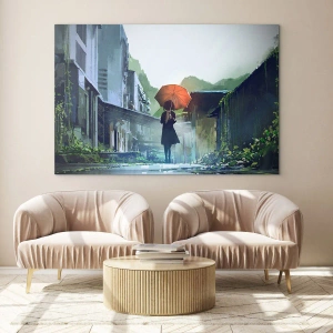 Glastavla - Bild på glas - En figur med ett orange paraply på en regnig gata - 70x50cm - Uppfriskande regn - Modern väggdekoration för vardagsrum och sovrum ARTTOR