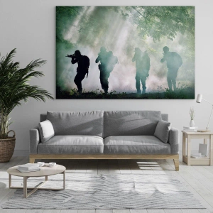 Glastavla - Bild på glas - En grupp soldater i rök, som går genom skogen, i full beredskap - 70x50cm - En för alla... - Modern väggdekoration för vardagsrum och sovrum ARTTOR