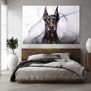 Detta glaskonsttryck som föreställer ett porträtt av en svart hund i abstrakt stil mot en ljus bakgrund är en unik dekoration som kombinerar elegans med modernt konstnärligt uttryck. De skarpa detaljerna och kontrasten mellan den svarta hunden och den ljusa bakgrunden ger kompositionen en unik karaktär som drar ögat till sig och ger harmoni till interiören.