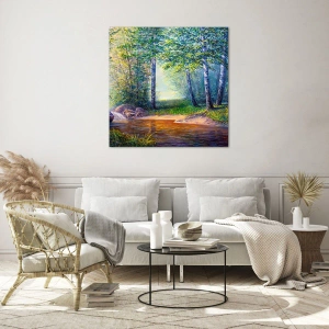 Glastavla - Bild på glas - En skogsbäck omgiven av träd i solens strålar - 70x50cm - Idyllisk vy - Modern väggdekoration för vardagsrum och sovrum ARTTOR