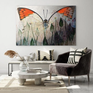 Målningen med en fjäril och blommor är ett förslag för dem som uppskattar konst inspirerad av naturen och dekorationer med en subtil och romantisk karaktär. Det är ett utmärkt val för dem som vill introducera element av naturlig skönhet och harmoni i sin interiör.