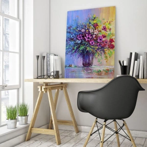 - Glasmålningen på 70x50 cm avbildar en färgglad blombukett i en vas mot en abstrakt bakgrund, perfekt för eleganta interiörer.