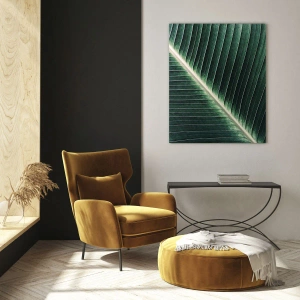 Väggbilden "Naturens rytm" visar en detaljerad vy av ett bananblad i en intensiv, naturlig grön nyans. Dess struktur och tydliga linjer skapar ett harmoniskt mönster som perfekt passar minimalismens och moderna arrangemangs estetik.