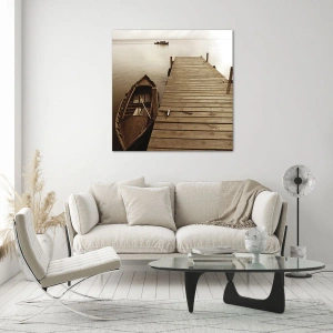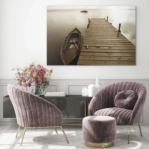 Glastavla - Bild på glas - En båt vid en pir på en lugn sjö i sepia - 70x50cm - Stora lugnet - Modern väggdekoration för vardagsrum och sovrum ARTTOR
