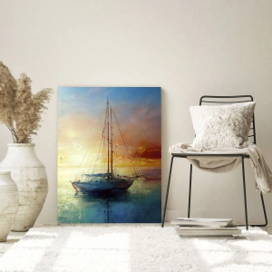 - Denna konstnärliga målning föreställer en segelbåt på ett lugnt hav, upplyst av den gyllene solnedgången. En unik dekoration som ger harmoni och elegans till alla interiörer.