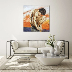 Glastavla - Bild på glas - En naken människokropp mot en intensivt orange himmel. - 70x50cm - Försänkt i sig själv - Modern väggdekoration för vardagsrum och sovrum ARTTOR