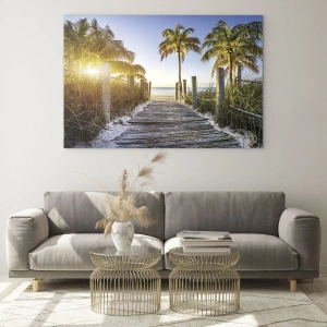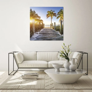 Glastavla - Bild på glas - Trästig på stranden omgiven av palmer - 70x50cm - Raka vägen till paradiset - Modern väggdekoration för vardagsrum och sovrum ARTTOR