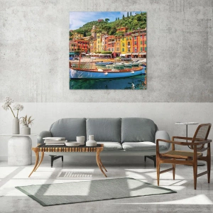 Glastavla - Bild på glas - Färgglada byggnader vid hamnen i en pittoresk stad - 70x50cm - Italiensk förmiddag - Modern väggdekoration för vardagsrum och sovrum ARTTOR