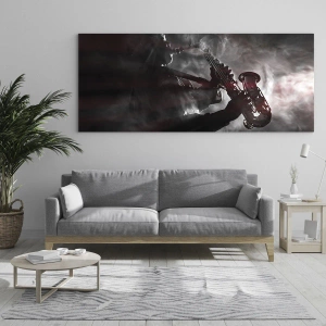 - Denna glasmålning på 70x50 cm föreställer en saxofonist i ett rökmoln. Den monokromatiska kompositionen skapar en atmosfärisk och konstnärlig dekoration, perfekt för eleganta interiörer.