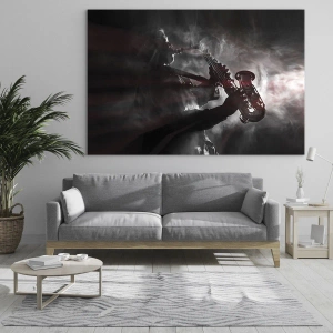 Glastavla - Bild på glas - Saxofonist i ett rökdis i svartvitt - 70x50cm - I jazzens ångor - Modern väggdekoration för vardagsrum och sovrum ARTTOR