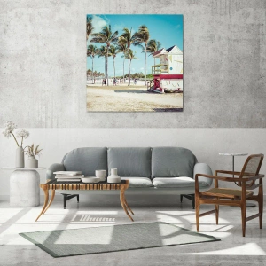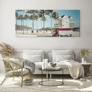 Glastavla - Bild på glas - En strand med palmer och ett livräddartorn på en solig dag - 70x50cm - En vacker dag framför dig - Modern väggdekoration för vardagsrum och sovrum ARTTOR