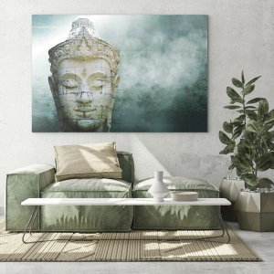 Målningens gröna bakgrund refererar till naturen och betonar dess närhet och balans. Buddhastatyns delikata detaljer ger elegans och skapar en sofistikerad dekoration som perfekt kompletterar orientalisk inredning.
