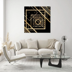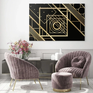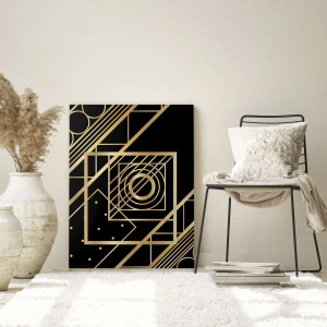Målningen passar perfekt in i art deco-, minimalistiska och moderna interiörer och introducerar ett element av sofistikering och klass. Användningen av gyllene detaljer i kombination med den svarta bakgrunden skapar en stark kontrast som ger karaktär och elegans till rummet.