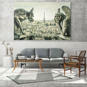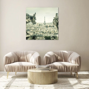Glastavla - Bild på glas - Gargoyler över Paris med utsikt över Eiffeltornet - 70x50cm - Ett samtal i Paris - Modern väggdekoration för vardagsrum och sovrum ARTTOR