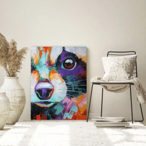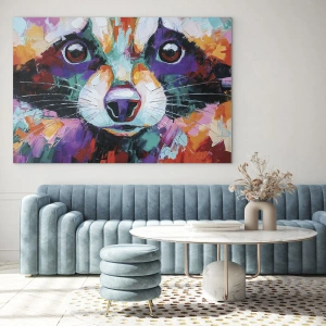 Glastavla - Bild på glas - Ett livfullt och färgstarkt porträtt av en tvättbjörn målad med djärva penseldrag - 70x50cm - Enbart goda emotioner - Modern väggdekoration för vardagsrum och sovrum ARTTOR