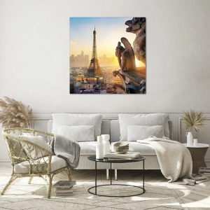 Glastavla - Bild på glas - Eiffeltornet i morgondimman, med utsikt över Paris och gotiska skulpturer - 70x50cm - En hel del har ändrats… - Modern väggdekoration för vardagsrum och sovrum ARTTOR