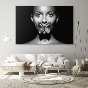 Väggkonst - Fjärilskyss - Porträtt av en kvinna med en fjäril på läpparna i svartvitt