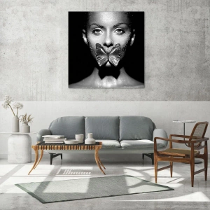 - Ett svartvitt porträtt av en kvinna med en fjäril som täcker hennes mun. Bilden utstrålar mystik, elegans och sensualitet, vilket skapar ett kraftfullt symboliskt budskap i en minimalistisk och modern form. En idealisk inredningsdekoration.