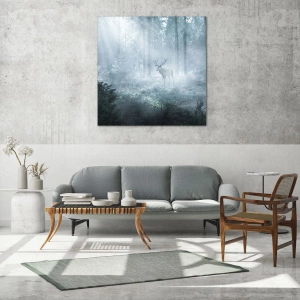 - En hjort står mitt i skogsdimman, upplyst av morgonsolen. Denna stämningsfulla, lugna komposition på ett 70x50 cm horisontellt glastavla från ARTTOR är perfekt för inredning inspirerad av naturen och minimalism.