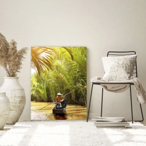 Glastavla - Bild på glas - En båt med en man som ror den seglar genom en palmkantad ravin - 70x50cm - Genom en palmravin - Modern väggdekoration för vardagsrum och sovrum ARTTOR