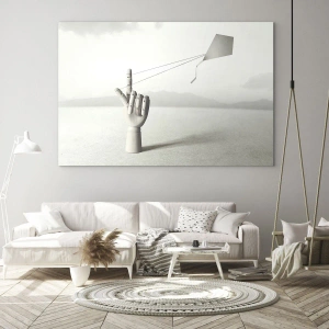 - Målningen föreställer en stiliserad trähand med ett upphöjt finger som håller en drake på ett snöre. Kompositionen, i nyanser av vitt och grått, förmedlar minimalism och den symboliska spänningen mellan kontroll och frihet.