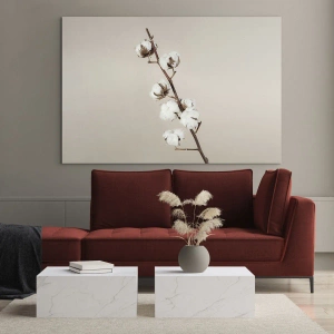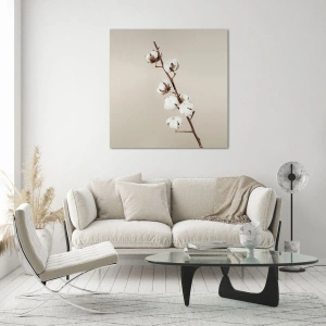 Glastavla - Bild på glas - En kvist bomull på en ljus, minimalistisk bakgrund - 70x50cm - Hos mjukhetens källa - Modern väggdekoration för vardagsrum och sovrum ARTTOR