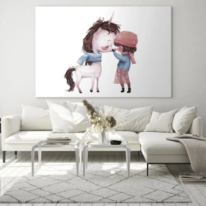 Detta horisontella tryck passar perfekt in i ett barns interiör, särskilt i utrymmen som är avsedda att framkalla en känsla av trygghet, värme och en sagolik atmosfär. Temat vänskap mellan ett barn och en magisk varelse har alltid väckt små barns fantasi. Det är perfekt för ett sovrum, en lekplats eller ett utbildningsutrymme.