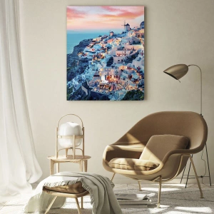 I förgrunden kan du se karakteristiska vita hus med blå accenter som forsar mot kusten. Kvällsljus livar upp arkitekturen, och pastellhimlen i nyanser av rosa och blått skapar en atmosfärisk bakgrund för hela kompositionen. Denna scen fångar perfekt atmosfären på de grekiska öarna, deras magi och charm.