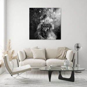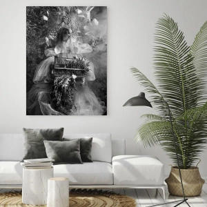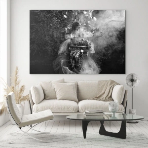 Fotot är fullt av betydelser och associationer - kronan av naturliga element frammanar den arketypiska bilden av Moder Natur, medan buren kan symbolisera begränsningar. Tyllen och röken förstärker intrycket av overklighet och andlighet. Målningen kommer att vara perfekt för vardagsrum, sovrum eller konststudior.