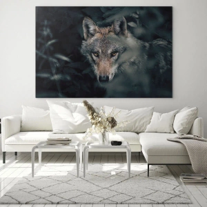 Glastavla - Bild på glas - En varg vaksamt tittar från sitt gömställe i skogssnåret - 70x50cm - Jägare - Modern väggdekoration för vardagsrum och sovrum ARTTOR