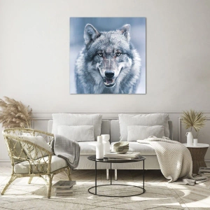 Glastavla - Bild på glas - En varg med en genomträngande blick mot bakgrunden av en snöig skog - 70x50cm - Tar du utmaningen? - Modern väggdekoration för vardagsrum och sovrum ARTTOR
