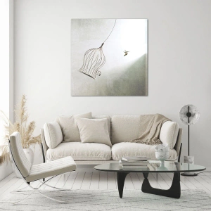 Glastavla - Bild på glas - En öppen bur och en kolibri som flyger iväg i dagsljus - 70x50cm - I sitt esse - Modern väggdekoration för vardagsrum och sovrum ARTTOR