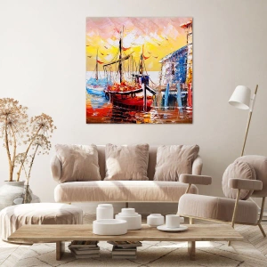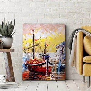 Det pittoreska landskapet av en hamn vid solnedgång är ett perfekt val för dem som uppskattar konst inspirerad av naturen och atmosfäriska dekorativa motiv. Denna målning introducerar en atmosfär av avkoppling och lugn i interiören, samtidigt som den tillför värme och unik stil. Reflektioner av ljus och skuggor på vattnet ger kompositionen djup, vilket gör den ännu mer uttrycksfull.