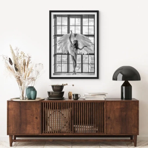 - Denna svartvita poster föreställer en kvinna med änglavingar mot ett stort fönster. Dess eleganta och subtila design gör den till en perfekt dekoration för ett vardagsrum, sovrum eller konstutrymme.