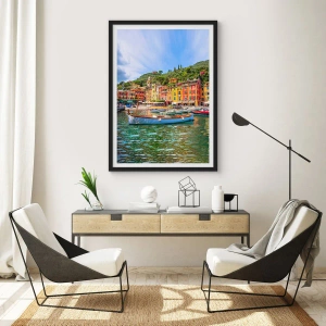 Affisch i svart ram - Hamnscen med färgglada byggnader och båtar - 50x70cm - Italiensk förmiddag - Modern väggdekoration för vardagsrum och sovrum ARTTOR