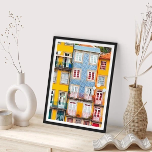 - Denna poster föreställer färgglada fasader på portugisiska radhus, fulla av detaljer och färg. Perfekt för moderna interiörer och levereras med en svart ram.