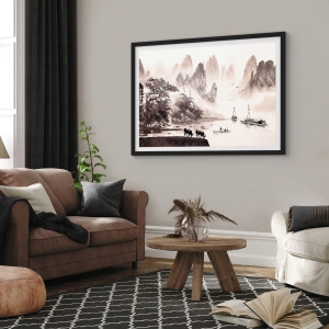 - Denna poster föreställer ett traditionellt kinesiskt landskap med berg och båtar. Perfekt för inredning i orientalisk stil och levereras med en svart ram.