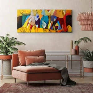 Canvastavla "Färgglad abstraktion som visar figurer i geometrisk form" är ett verk som kombinerar modern konst med en kreativ tolkning av figurer. Geometriska former och livfulla färger skapar en dynamisk komposition som inspirerar och lockar ögat. Det är ett unikt dekorativt element som ger karaktär och energi till interiören.