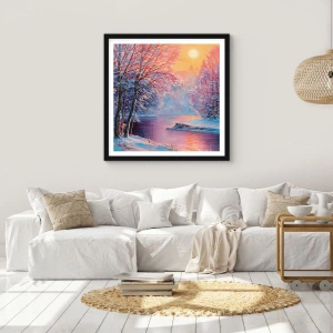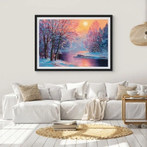 Affisch i svart ram - Vinterlandskap med en flod i skenet av den nedgående solen - 50x70cm - Vinterns färger - Modern väggdekoration för vardagsrum och sovrum ARTTOR
