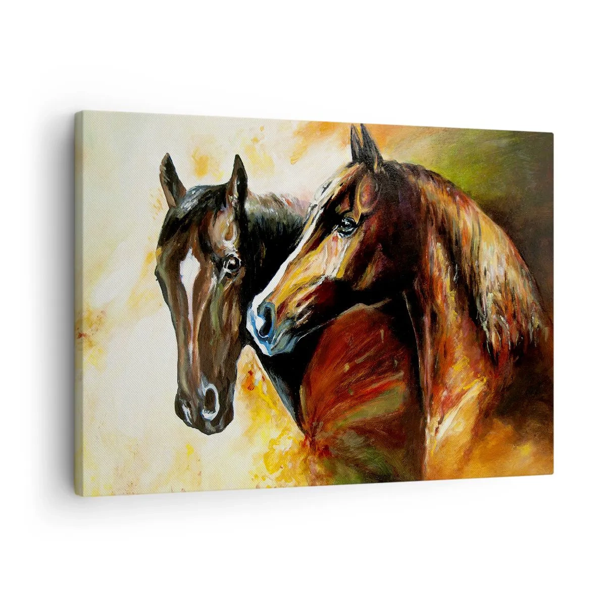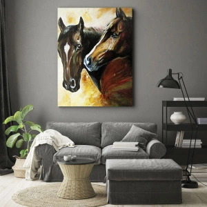 Målningens färger är baserade på varma nyanser av brunt, guld och grönt, vilket ger kompositionen en lätthet och subtilitet. Detaljer som hästarnas pälsstruktur och subtila ljus och skugga betonar målningens konstnärliga uttryck. Detta är det perfekta alternativet för dem som uppskattar djurens skönhet och vill ge sin interiör en naturlig touch.