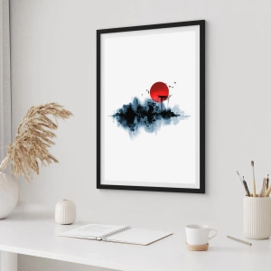 - Denna poster föreställer en röd sol ovanför en japansk toriiport, återgiven i minimalistisk akvarellstil. Perfekt för älskare av orientalisk konst.