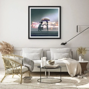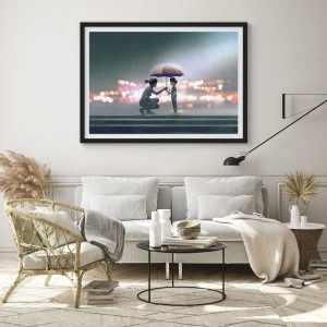 Affisch i svart ram - En vuxen som räcker ett paraply till ett barn mot en regnig bakgrund - 50x70cm - Och allt är väl nu - Modern väggdekoration för vardagsrum och sovrum ARTTOR