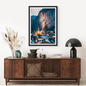 Affisch i svart ram - Upplyst vinterby vid foten av klippan - 50x70cm - Vinterns ljusa ande - Modern väggdekoration för vardagsrum och sovrum ARTTOR