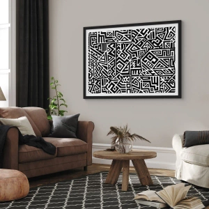 Affisch i svart ram - Svartvitt geometriskt mönster i konstnärlig stil - 50x70cm - Prekolumbisk komposition - Modern väggdekoration för vardagsrum och sovrum ARTTOR